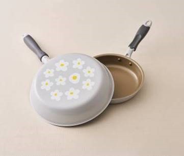 ガス火専用の軽量フライパンに手書き風の白いお花がデザインされた、春らしいかわいいフライパンです。